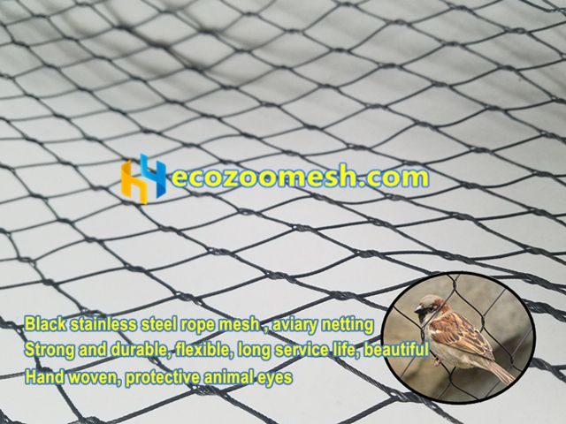 Black stainless steel aviary netting is a special surface oxide treatment of stainless steel wire rope mesh, HAND WOVEN. Black stainless steel aviary netting and natural color stainless steel aviary mesh in addition to the surface is black, with other same characteristics: strong tensile strength, breaking strength, good flexibility, corrosion resistance, no rust, beautiful, long service life, custom mesh panel size, etc.
